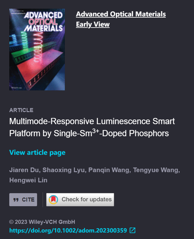 近日,江南大学betway中国西汉姆联官网林恒伟教授光功能材料研究团队,在无机智能响应性发光材料上取得研究进展,相关成果以“Multimode-Responsive Luminescence Smart Platform by Single-Sm3+-Doped Phosphors”为题发表在光学权威期刊Advanced Optical Materials上(原文链接:https://onlinelibrary.wiley.com/doi/10.1002/adom.202300359)。该项工作的主要贡献者为硕士研究生吕绍星、王潘琴和王腾跃同学,论文的通讯作者为林恒伟教授、杜家仁副教授。