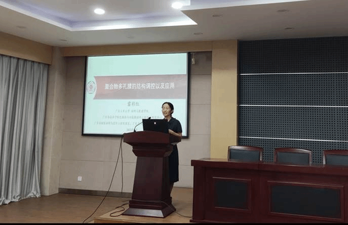 雷彩红教授做了题为“聚合物多孔膜的结构调控以及应用”的报告,并总结介绍了广东省高分子绿色制造与功能膜材料工程技术研究中心已开展的工作以及重点研究方向。雷彩红教授首先归纳了熔体拉伸、热诱导相分离、溶剂诱导相分离等多种成孔方法的优缺点,通过介绍PP/PE双层共挤膜的制备、熔体拉伸PBS中空纤维膜结构调控以及在烟气过滤应用、熔体拉伸TPX中空纤维膜结构调控以及在气体分离中的应用等研究成果,系统的讲解了聚烯烃、PBS等可生物降解聚合物多孔膜的可控成孔结构及其在离子分离、气体分离等领域的应用开发。