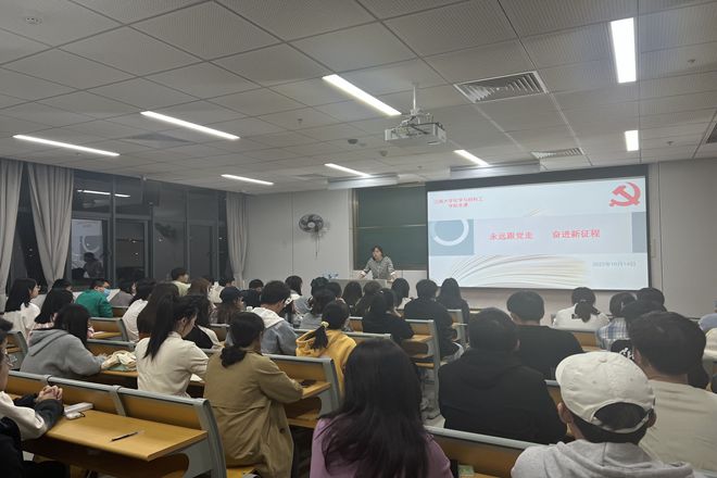 10月14日晚,我院“永远跟党走、奋进新征程”专题党课暨研究生新生党支部成立大会在知行楼C202教室举行。学院党委副书记、副院长田卫平以“永远跟党走,奋进新征程,做合格共产党员”为题,从开展“永远跟党走、奋进新征程”主题教育、学习“七一”重要讲话等重要精神、加强党支部的建设和掌握党务基本知识、如何做一名合格党员四个方面为学院2022级研究生党员讲授党课。