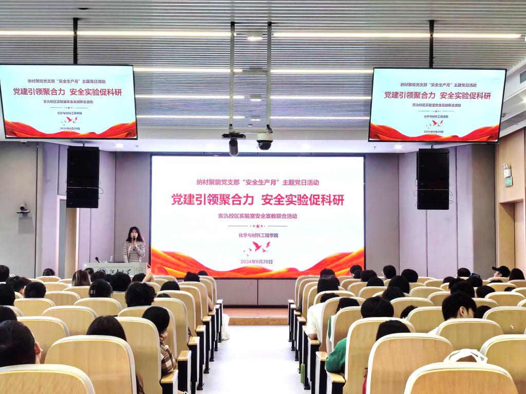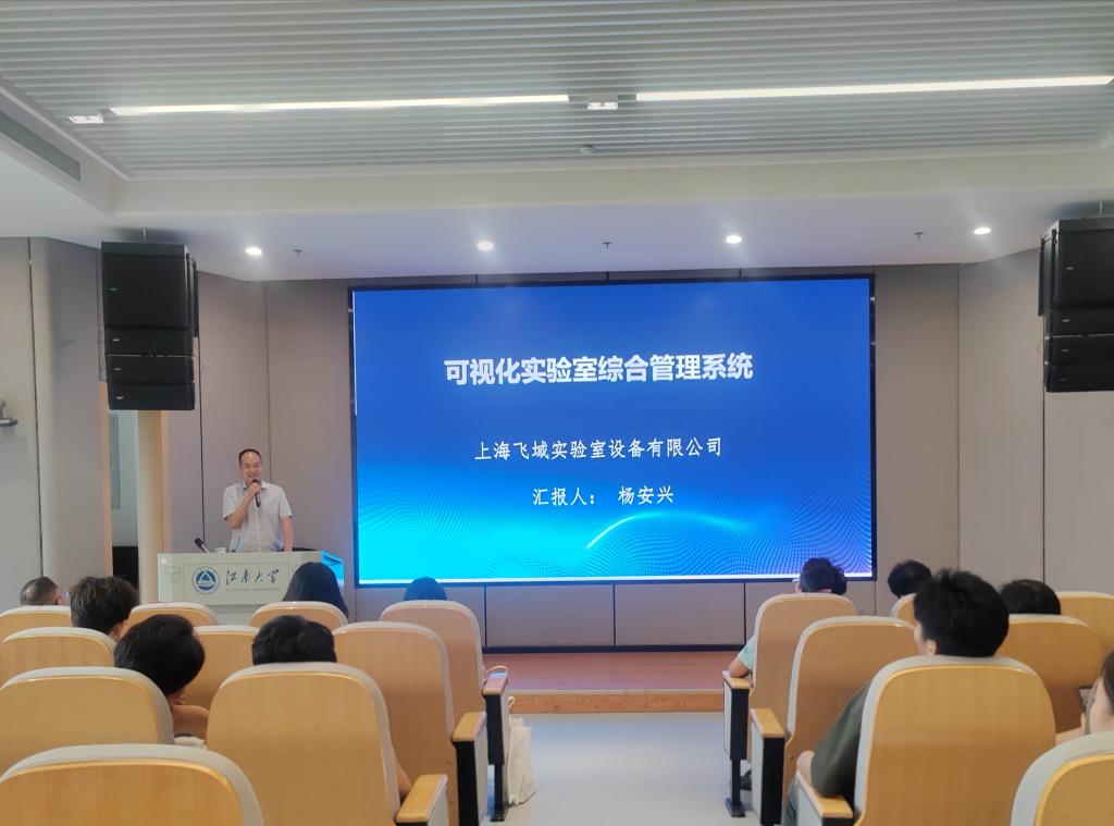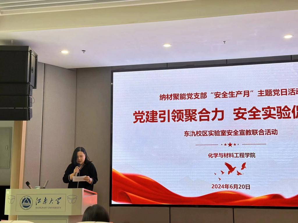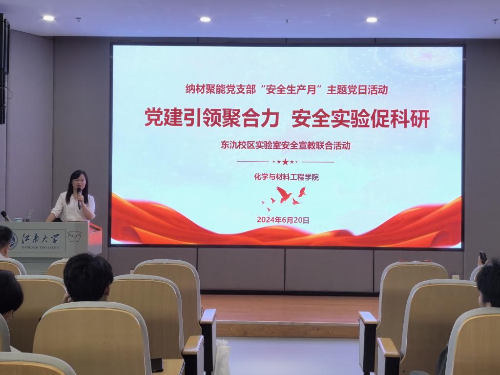 为深入学习贯彻习近平总书记关于安全生产的重要论述和指示精神,落实教育部关于校园安全稳定工作的部署要求,值此全国第23个“安全生产月”之际, 为增强师生实验室安全意识和应对突发事件的能力,营造浓厚的实验室安全氛围,6月20日,纳材聚能党支部开展“党建引领聚合力,安全实验促科研”实验室安全专题活动。本次活动特别邀请了上海飞域实验室设备有限公司总经理杨安兴、经理何鑫和无锡粒子云信息科技有限公司工程师庞丽丽进行专题讲解。江南大学宜兴研究生院办公室副主任倪寒冰、化工学院党委副书记兼副院长董霞、宜兴研究生院办公室科长徐怡学以及化工学院实验室安全管理教师张一波出席活动,化工学院辅导员李晓洁主持本次活动。