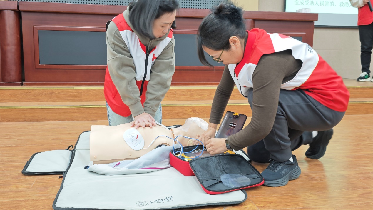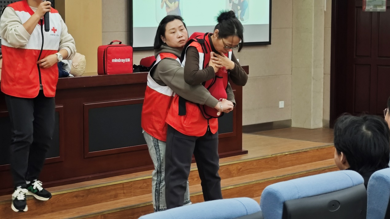 此次讲座特邀了红十字会救护培训师、无锡市红十字赈济救援队副队长唐镇棣主讲,红十字会救护培训师蒋小燕、助教老师顾瑾现场协助。讲座通过对急救知识的讲解、急救情况视频播放和现场带领学生实际演练等方式,全面介绍了救护相关法律法规、应急救护流程以及日常意外和急症的救护原则。