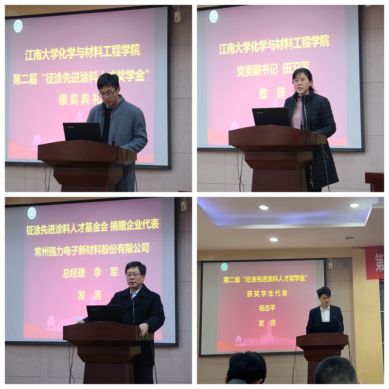 常州强力电子新材料股份有限公司总经理李军、江苏开磷瑞阳化工股份有限公司副总经理覃福作、江苏广信感光新材料股份有限公司总经理办公室主任袁燕华、化工学院党委副书记田卫平出席了本次颁奖典礼。本次颁奖典礼由实验室与设备管理处处长、化工学院教授刘仁主持。