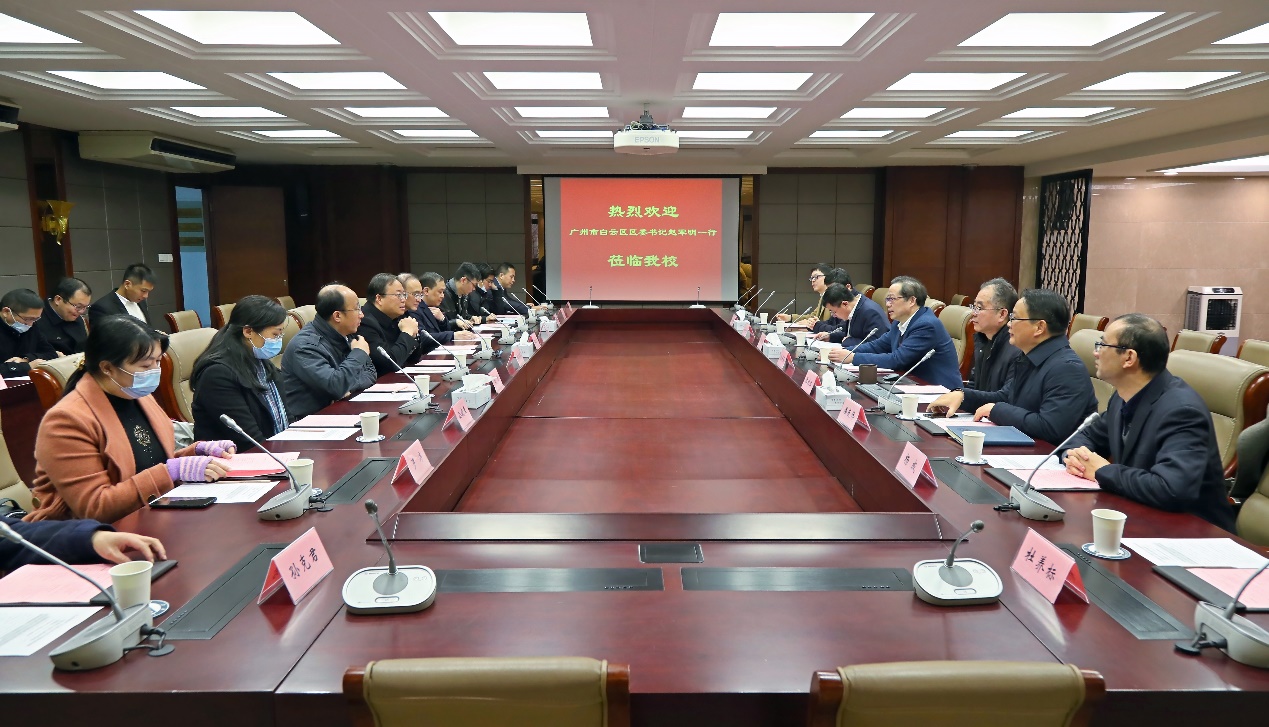 1月22日上午,广州市白云区委书记赵军明、区委副书记潘志军、副区长蔡胜以及白云区各部门主要负责人一行15人来校推进“江南大学-白云美湾国际化妆品研究院”合作共建工作。校党委书记朱庆葆,副校长顾正彪,校长助理张光生,产业技术研究院、betway中国西汉姆联官网等部门和学院负责人,以及江南大学化妆品创新中心负责人参加会议。会议由betway中国西汉姆联官网党委书记潘庆伟主持。