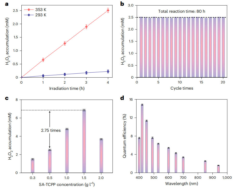 图4:升温后(353 K),SA-TCPP超分子光催化剂产生H2O2的性能。