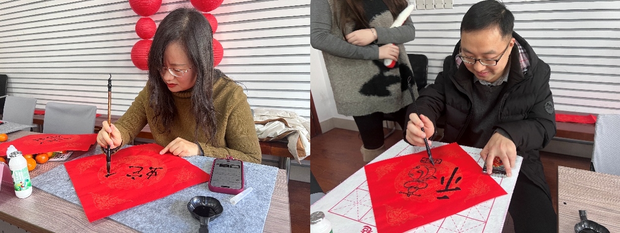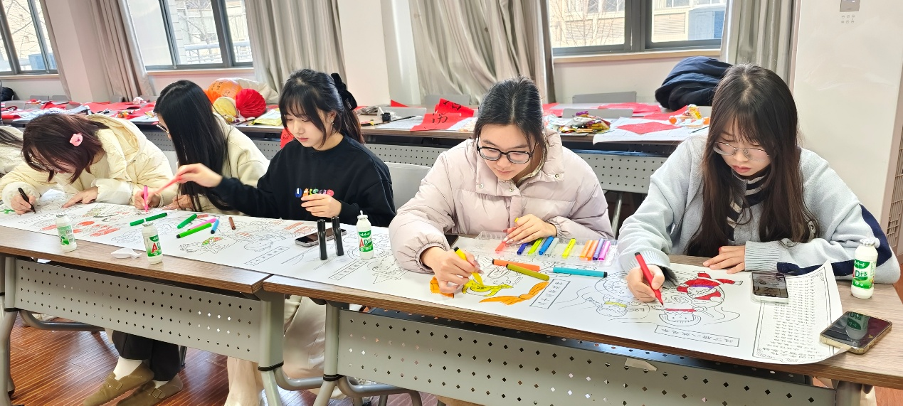 活动现场,精彩环节接连不断。在“笔墨生香迎新年”环节,师生们一同挥毫泼墨写福字、精心拓印福字,每一个福字都饱含着对新年的美好期许,传递着真挚的祝福,让大家深切领略到传统节日的独特魅力。紧接着“手绘习俗缓心情,涂鸦彩绘迎新春”活动中,师生们共同绘制包含24个春节习俗新春画卷,大家用彩笔勾勒,在涂鸦过程中深入学习中国传统习俗,有效缓解了科研带来的压力。绘画结束后进行习俗抽奖,现场欢声笑语一片。