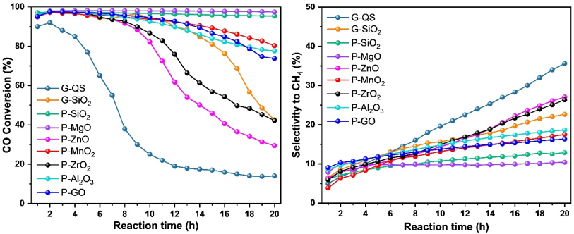 评论观点文章认为:铁基费托合成在反应过程中十分容易发生无定形碳和石墨碳的快速集聚,导致催化剂失活和选择性变化,研究者通常设法通过助剂调节、载体改性设计或活化过程优化来改善积碳引起的各种问题,然而这些策略使得合成和操作过程变得复杂,限制了工业应用过程中期望的简易规模化。江南大学刘小浩教授及其同事证实铁基催化剂与氧化物的简单混合即可重构铁基催化剂的表面化学,该过程能重新分布催化剂表面的电子密度,而不只是酸性,这将决定氧化物能否减慢“碳的成核”。二氧化硅(SiO2)和氧化镁(MgO)被证实作为特别有效的氧化物提升剂,这对长期以来的关于酸-碱性对费托合成反应性能的影响的讨论变得微妙。这个发现可延伸拓展到其他催化体系,特别是当过度碳化、结焦或者碳化物形成,从而破坏催化剂的长期稳定性。