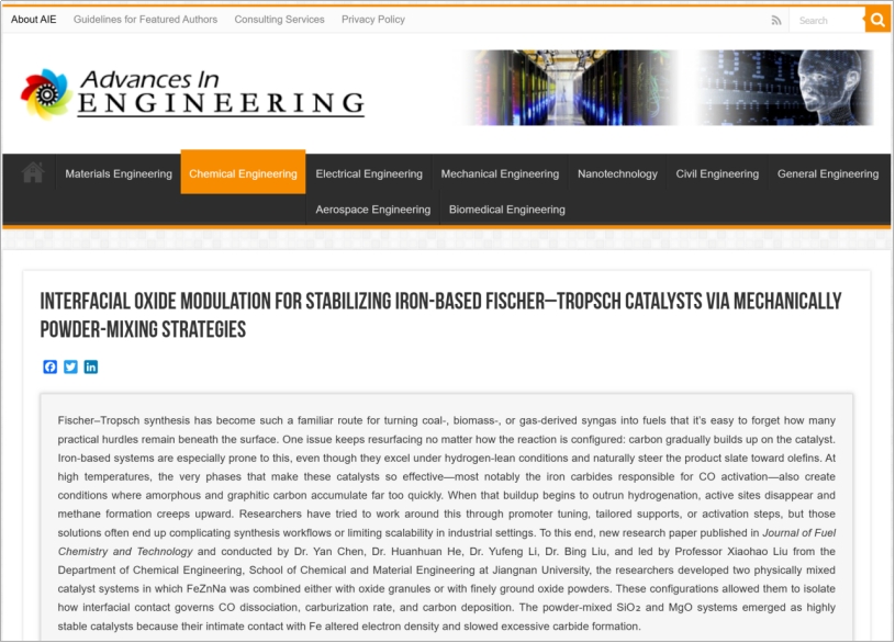 近日,江南大学刘小浩教授课题组以最简便的“机械混合”策略构建“氧化物-费托催化剂界面,Oxide-FTCat Interface”调控合成气铁基费托合成反应稳定性的研究成果“Study on the regulation of Fischer-Tropsch synthesis catalytic performance by mixing oxides with iron-based catalysts” inJournal of Fuel Chemistry and Technology,2025, 53(8), 1212–1222”被国际工程领域著名科技机构Advances in Engineering(简称为AIE)遴选为“通用工程领域关键科学文章”,并以“Interfacial Oxide Modulation for Stabilizing Iron-Based Fischer–Tropsch Catalysts viaMechanicallyPowder-Mixing Strategies”为题进行了重点专题报道。