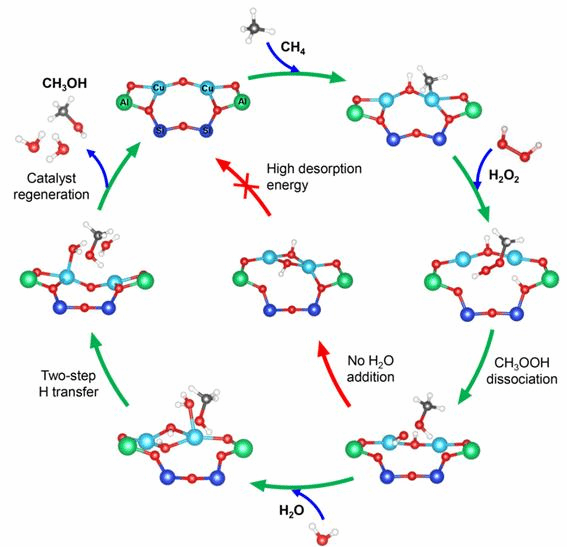 近年来,甲烷低温氧化直接制甲醇引起了学术界广泛的兴趣。采用H2O2作氧化剂,Fe-ZSM-5催化甲烷低温液相氧化制甲醇是常用的催化反应体系。该催化体系的主要缺点是反应过程为羟基自由基(·OH)机理(Fe活性中心能将H2O2分解为·OH),导致反应中间物种和目标产物容易过度氧化生成不期望的副产物如甲醛、甲酸和CO2等。为了解决甲醇产物过度氧化的问题,几个课题组尝试了采用各种各样的方法来减缓·OH的释放速度或捕获溶液中过量的·OH,从而避免其过度氧化。文献报道引入Cu2+或Cu clusters等铜物种能明显提高甲醇的选择性,由于其能消耗溶液中存在的过量·OH,但催化活性显著下降。基于此实验现象,研究人员普遍认为Cu物种在H2O2作氧化剂的低温氧化体系中没有催化活性。