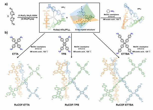 三联吡啶Ru(II)及其衍生物是经典的光敏分子,具有强可见光吸收、高氧化还原能力和长激发态寿命。具有多面体几何构型的Ru(II)配合物适合于构筑3D MCOFs(图1)。得益于MCOFs的晶态特征,Ru(II)光敏单元可以被精准地均匀定位于框架结构中,有效促进光吸收和电子转移。此外,3D结构的贯通孔道更加有利于活性位点的暴露、促进底物的扩散。