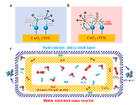 3.双钯活性位点促进乙醇生成的作用机制(a,b)和结构封装双钯活性位点-纳米“蓄水”膜反应器的结构示意图(c)
