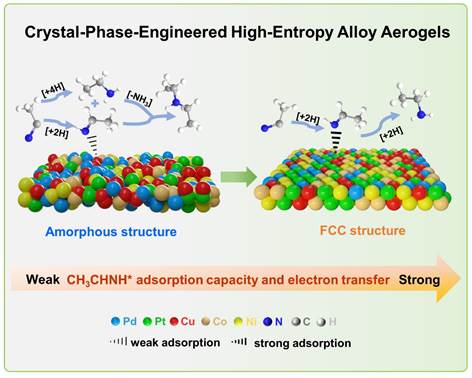 乙腈是Sohio法制备丙烯腈的主要副产物。目前仅有少数厂家对其进行回收利用,且大多采用燃烧处理,导致氮氧化物大量排放,对环境危害严重。在不同的电催化条件下,乙腈可以还原为乙胺、3-氨基丁腈、氨等物质。其中,乙胺作为重要的化工原料和有机合成中间体已广泛应用于医药、农药和染料工业。因此,电催化乙腈加氢制乙胺作为绿色环保的方法可以将乙腈的过剩产能转化为高附加值的乙胺产品,从而引起了广泛关注。但在电催化乙腈还原反应(ARR)中,由于中间体亚胺的亲核性质,其会继续与伯胺反应生成仲胺和叔胺,生成乙胺、二乙胺和三乙胺的混合物。因此,设计和开发具有高乙胺选择性的ARR电催化剂已成为研究热点。近年来,高熵合金气凝胶(HEAAs),得益于金属气凝胶结构丰富的活性位点、优异的结构稳定性和大量的电子转移通道以及高熵结构的多金属协同作用,是一种高效稳定的新型电催化剂。然而,由于不同金属的还原电位和混溶行为的差异,目前对HEAAs的研究主要集中在固溶体相,这限制了HEAAs的应用范围及性能提升。因此,获得具有明确晶相结构的HEAAs,并揭示其晶相转变规律是开发新型高效的高熵合金催化剂的关键,但目前仍面临巨大挑战。而晶相调控可通过活性原子重排形成新的晶体结构,从而优化电子结构并提升催化效率。因此,晶相调控策略有望突破HEAAs的设计瓶颈,获得高效稳定的新型ARR催化剂。