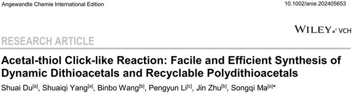 该研究为绿色高效合成二硫缩醛和可回收聚二硫缩醛提供了一种有前景的类点击反应,有利于有机化学、高分子化学、材料化学和药物化学等领域的可持续发展。该工作以“Acetal-thiol Click-like Reaction: Facile and Efficient Synthesis of Dynamic Dithioacetals and Recyclable Polydithioacetals”为题发表在《Angew. Chem. Int. Ed.》上(Angew. Chem. Int. Ed. 2024, e202405653)。文章第一作者是betway中国西汉姆联官网博士生杜帅。该研究得到国家自然科学基金委的支持。
