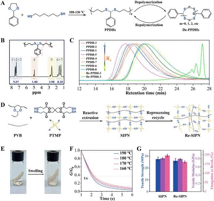 近期,江南大学betway中国西汉姆联官网马松琪教授团队报道了一种无催化剂和无溶剂的缩醛-硫醇类点击反应,用于合成二硫缩醛和聚二硫缩醛。可实现缩醛-硫醇的高转化率,高于同条件下酸催化的缩醛-硫醇反应。通过选用系列具有代表性结构的线性缩醛和环状缩醛(包括可再生的生物基衍生物呋喃缩醛)与脂肪类和芳香类硫醇的反应,证明了缩醛-硫醇在无催化剂和无溶剂下具有较高的反应转化率和普适性。经过对典型缩醛-硫醇不同温度下的反应动力学监测,发现反应符合准一级反应动力学。结合实验和密度泛函理论计算,证明反应遵循SN1反应机理,即巯基质子化缩醛(活化),进而产生碳正离子,被硫醇亲核攻击,生成S,O-缩醛,最终生成二硫缩醛。随后,我们利用该反应合成了易于回收的聚二硫缩醛。通过简单的加热和搅拌,以缩醛和二硫醇为原料,合成了MW最高为110 kDa的线性聚二硫缩醛,解聚得到大环二硫缩醛,再聚合得到聚二硫缩醛;以聚乙烯醇缩丁醛(PVB)和四(3-巯基丙酸)季戊四醇酯(PTMP)为原料,通过双螺杆挤出机反应挤出,制备了力学性能优良、可连续再加工的半互穿聚合物动态网络。回收后的半互穿网络的性能与原半互穿网络相当。
