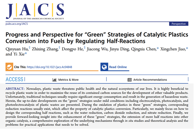 近期,betway中国西汉姆联官网焦星辰教授、陈庆霞副教授与中国科学技术大学谢毅院士合作,在温和条件下塑料催化转化方面发表重要观点论文,相关工作在“J. Am. Chem. Soc.”上发表:Progress and Perspective for “Green” Strategies of Catalytic Plastics Conversion into Fuels by Regulating Half-Reactions。J. Am. Chem. Soc.每年发表论文3千余篇,其中仅20篇左右是由主编亲自邀请各重要前沿分支的领军学者,就领域性进展和前瞻撰写的Perspective文章,其对学科发展的重要意义和权威性不言而喻。该论文化工学院2022级硕士研究生胡秦源、2023级硕士研究生张志兴和2023级博士生何东坡为共同第一作者。