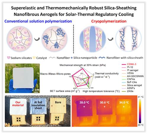 气候变化和极端高温环境下,空调的大量使用对全球能源系统造成巨大影响。为实现我国的“双碳”目标,减少建筑、设备和人体等的降温能耗至关重要。为了有效降低建筑能耗并创造舒适的室内环境,亟需设计能够隔绝外部高温和强烈阳光的围护结构。无机气凝胶因其轻质、隔热和阻燃等特性成为建筑围护结构的理想选择,然而,其进一步发展受到力学脆性和制备工艺复杂等问题的限制。相比之下,聚合物气凝胶因其可定制的分子结构和易加工的特点备受关注,但易燃性限制了其在高温和火灾等风险环境中的应用。因此,发展具有高力学柔性、极端温度耐受性和太阳光-环境热协同管理性能的气凝胶新材料,成为满足高效建筑热管理需求的关键挑战。