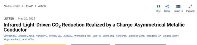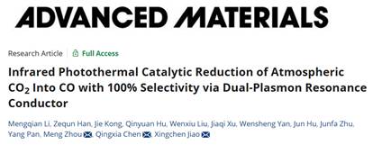 近期,我校化工学院焦星辰教授课题组在CO2催化转化方面取得重要进展,研究成果“Infrared Photothermal Catalytic Reduction of Atmospheric CO2Into CO with 100% Selectivity via Dual-Plasmon Resonance Conductor”在线发表于Adv. Mater. (https://doi.org/10.1002/adma.202503021),“Infrared-Light-Driven CO2Reduction Realized by a Charge-Asymmetrical Metallic Conductor”在线发表于Nano letters (https://doi.org/10.1021/acs.nanolett.5c01505)。