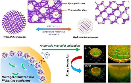针对这些问题,研究团队另辟蹊径。他们在常规微凝胶颗粒表面共价生长疏水二氧化硅颗粒,成功制备出不同形貌的疏水二氧化硅包裹微凝胶。这种特殊的微凝胶性能卓越,在37 °C时能够稳定油包水(W/O)型Pickering乳液。而37 °C正是多数细菌的最佳培养温度,为细菌生长提供了理想环境。与此同时,乳液中的油相如同“氧气隔离罩”,为厌氧菌营造出绝佳的厌氧限域空间,极大地促进了厌氧菌的生长繁殖。