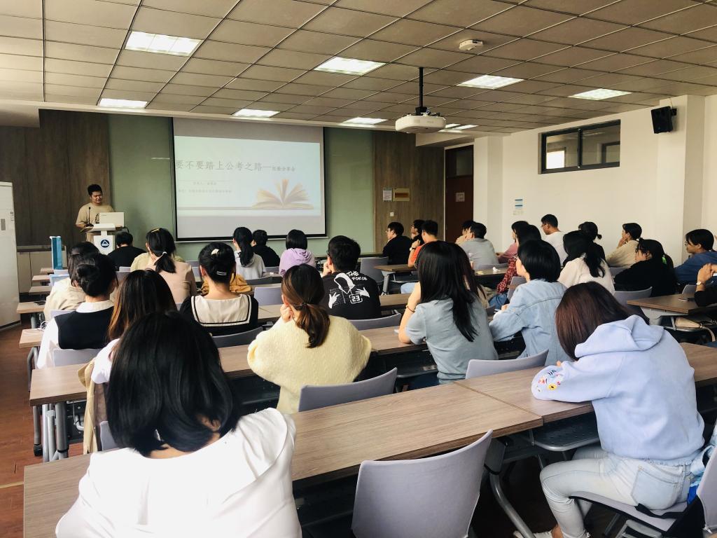 随后,曲寒洛介绍了公务员和事业编的区别,同时,除常规的公考选调制度外,他还介绍了当下各地的人才引进制度。并以自己的工作经验为例,向同学们展示了国家公务员作为党服务人民的基层力量,面临的工作的复杂和难度,承担着心系群众、深入群众的责任。之后是提问交流环节,同学们积极发言,曲寒洛师兄都耐心地进行了解答,曲寒洛向同学们表示,在考虑优势光环的下面,大家也该明确公考的难度,选择要慎重。希望大家如果决定要踏上公考之路,一定要坚定的不忘初心。