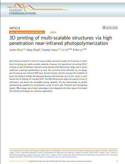 在中国制造创新版图上,3D打印(也称增材制造)作为核心技术之一,正从航空航天、汽车电子、军事国防、生物医疗等方面全面推进相关发展。“材料-结构-制造-功能”的一体化制造概念成为我国智能制造发展的重要方向,材料与制造的相辅相成已为主要趋势。当新型感光材料与3D打印技术在我校的相遇,直接带来了相关方向的重要技术突破。我校betway中国西汉姆联官网刘仁教授团队长期致力于光聚合基础及其在涂料、微电子和3D打印领域的应用技术研究;机械工程学院刘禹教授团队主要开展3D打印工艺与机电装备技术研究。双方团队联合攻关,基于近红外激发上转换粒子原位发射紫外-可见光的策略,设计了全新的3D打印材料,并在自主设计的工艺装备上,率先建立近红外辅助3D墨水直写技术,实现了多色彩材料、跨尺度(3个量级制造分辨率)、无支撑的3D打印,打破了传统三维成形方法的材料局限性与制造精度局限性,有望加速3D打印技术在柔性传感、软体机器人与生物医疗领域的应用。